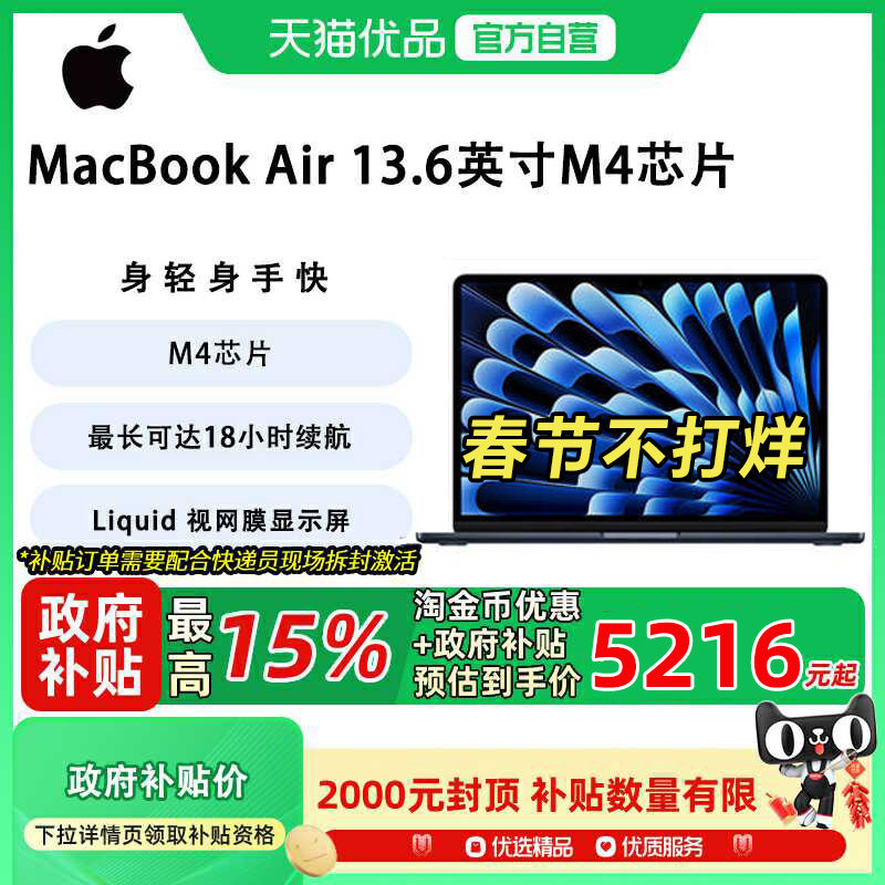 笔记本电脑 【政府补贴15%】Apple/苹果 Macbook Air 13.6英寸 M4芯片 笔记本电脑