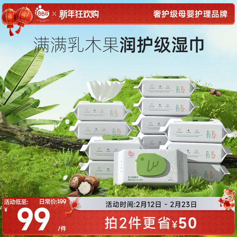 婴童用品 BBG乳木果湿巾50抽*12包精华婴幼儿手口家用大包加大加厚