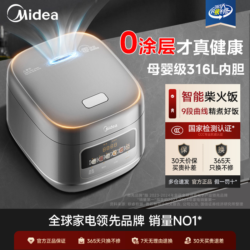 厨房电器 美的新款家用0涂层电饭煲316L不锈钢锅大容量智能3-4-6人官方正品
