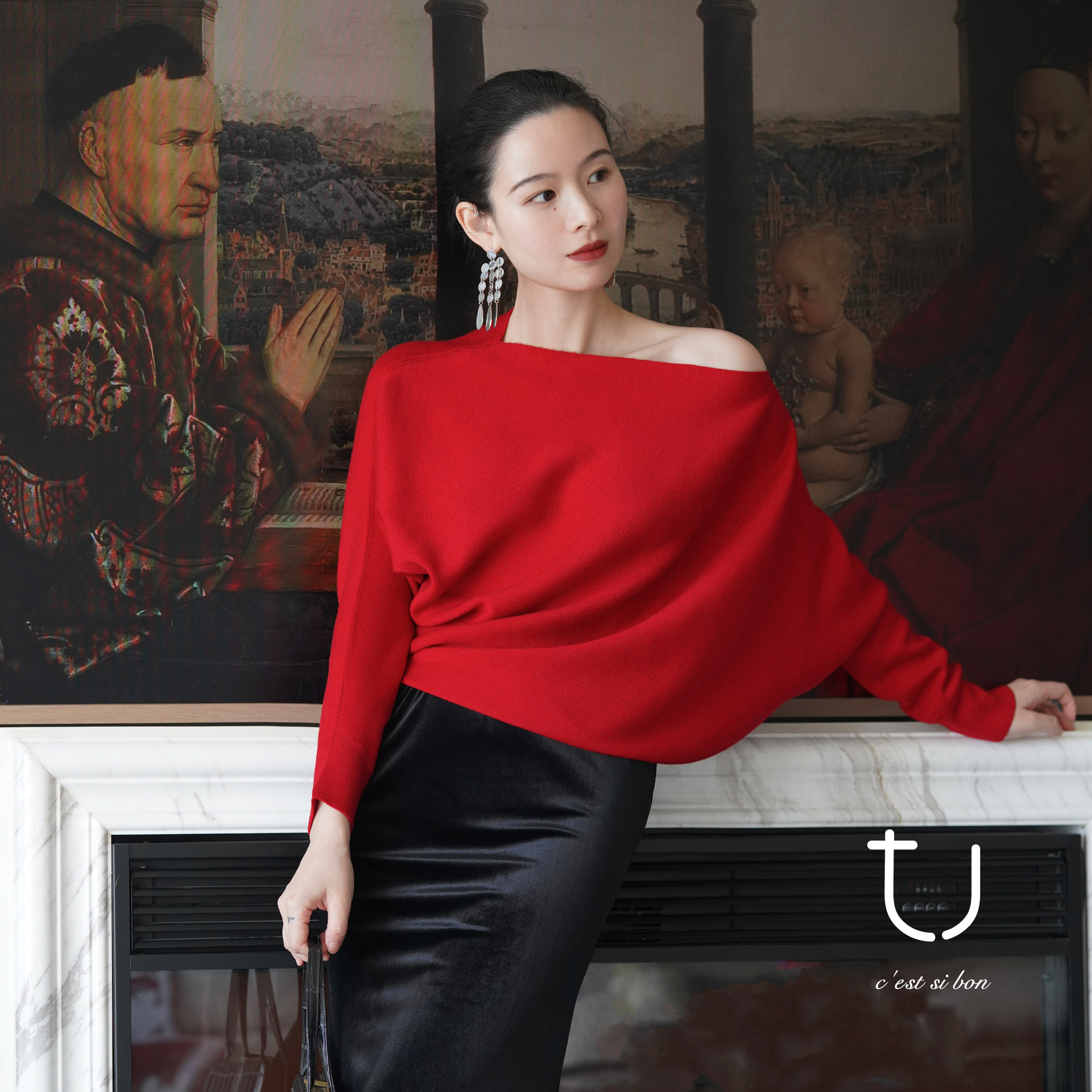 女装/女士精品 明星同款 TU女装红色羊毛针织衫26春新款斜肩型毛衣新年穿搭上衣