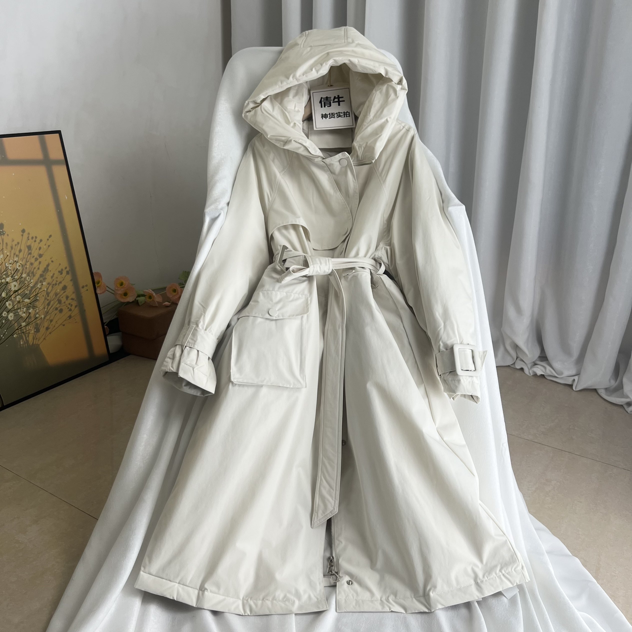 女装/女士精品 倩牛撤柜高档女装】少量 可收腰设计防风羽绒服长款连帽风衣外套
