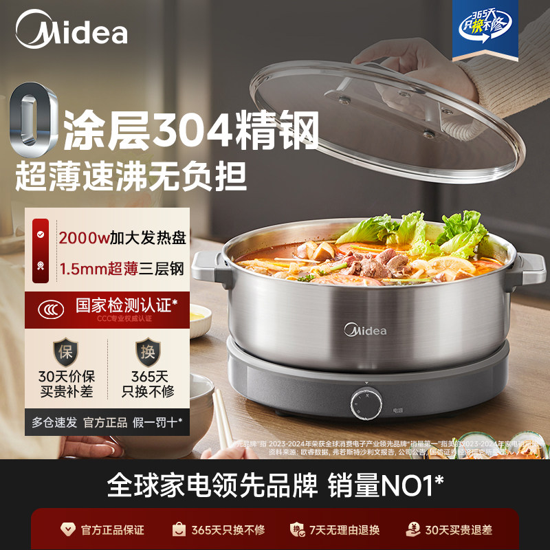厨房电器 美的火锅电热锅0涂层不锈钢分体家用新款电煮锅多功能大容量炒锅