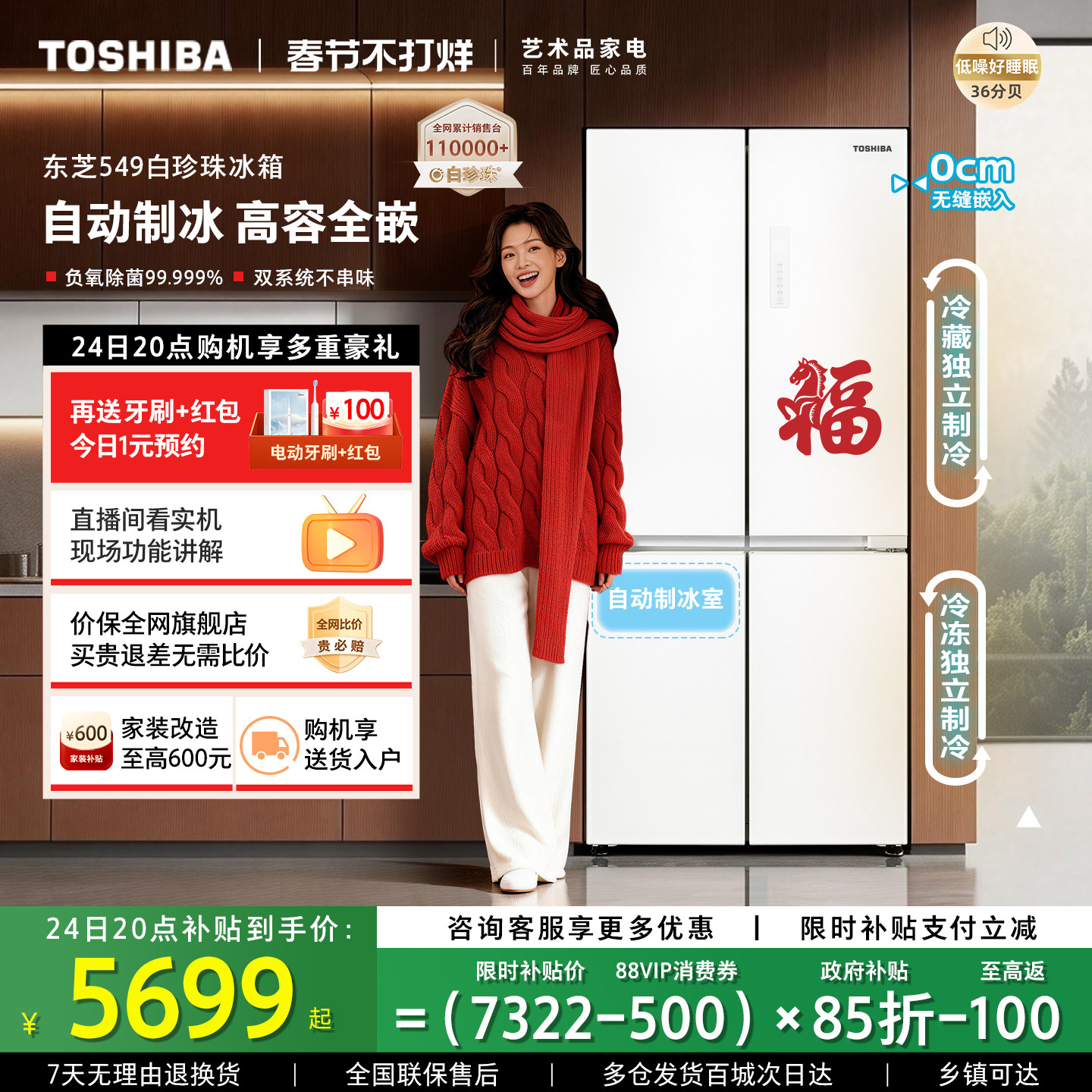 大家电 东芝白珍珠549零嵌入十字门双系统一级能效家用制冰冰箱以旧换新