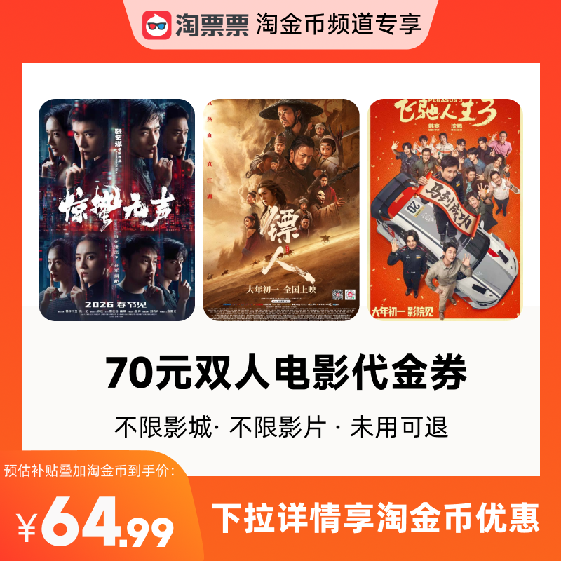 电影/演出/体育赛事 【详情领取淘金币优惠】淘票票70元双人票代金券不限影城不限影片