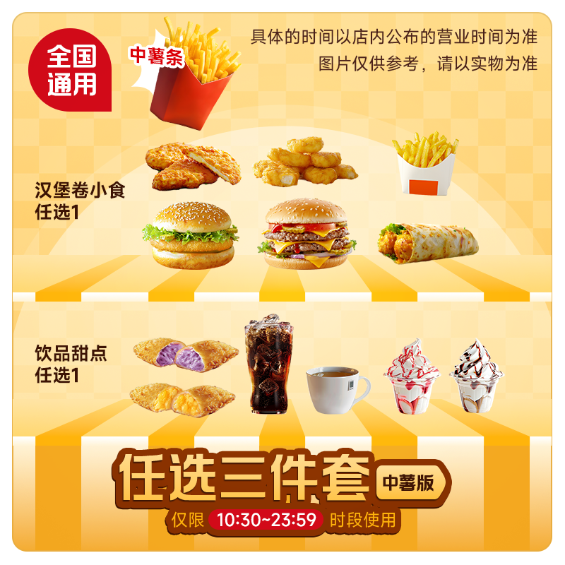 餐饮美食卡券 麦唛当劳优惠大堡口福三件套(3选1)汉堡薯条兑换券代下单门店自取