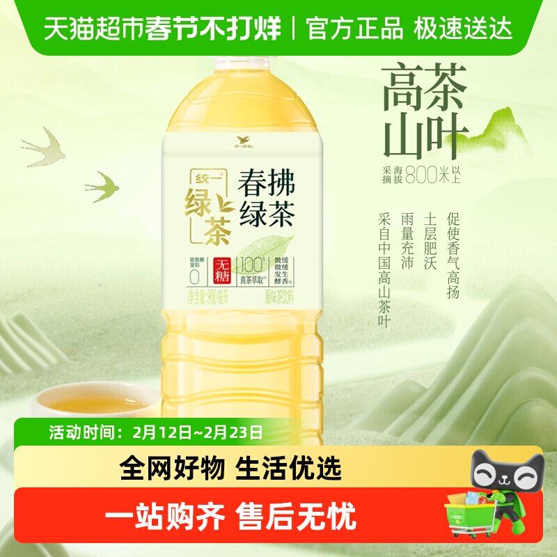 咖啡/麦片/冲饮 统一无糖绿茶春拂绿茶900ml*8瓶0糖0脂100%真茶萃取大瓶饮料整箱