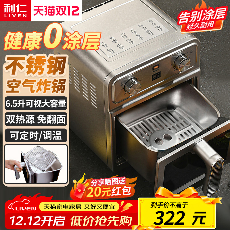 厨房电器 利仁小钢人不锈钢空气炸锅家用0涂层新款大容量双热源可视电炸锅
