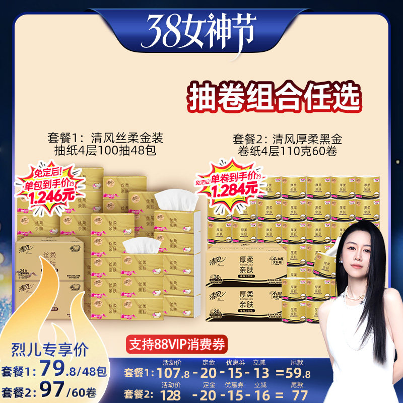 洗护清洁剂/卫生巾/纸/香薰 【先加购!24号烈儿0元付定】清风金装丝柔抽纸黑金卷纸套组任选