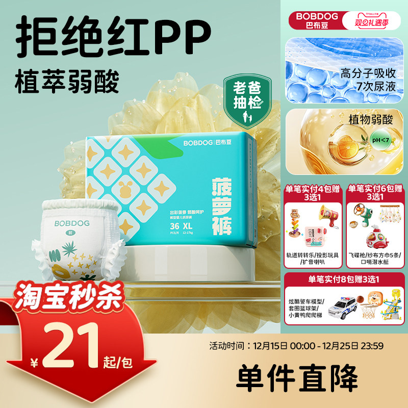 婴童尿裤 【淘秒】 巴布豆菠萝mini拉拉裤纸尿裤弱酸亲肤透气婴儿尿不湿
