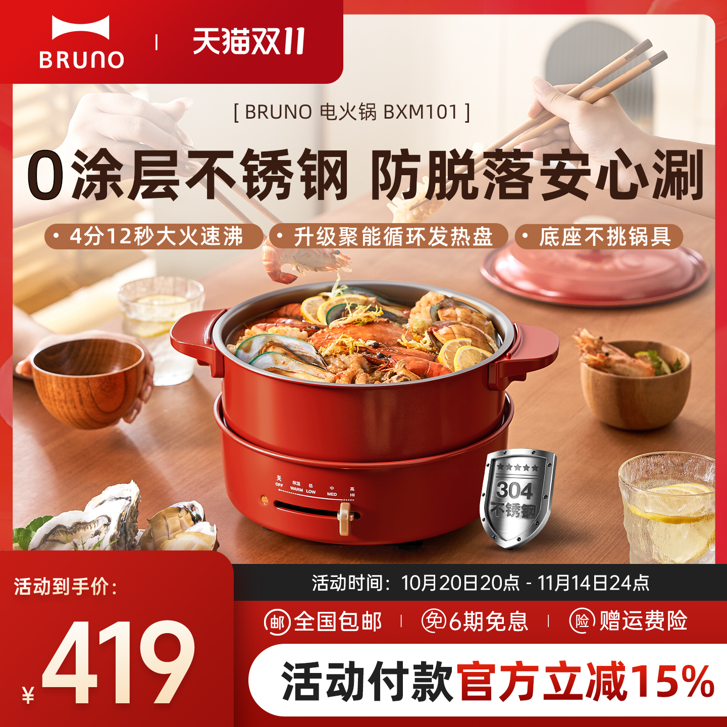 厨房电器 BRUNO小电煮锅电火锅多功能烤肉蒸锅304不锈钢一人食企鹅锅烹饪机