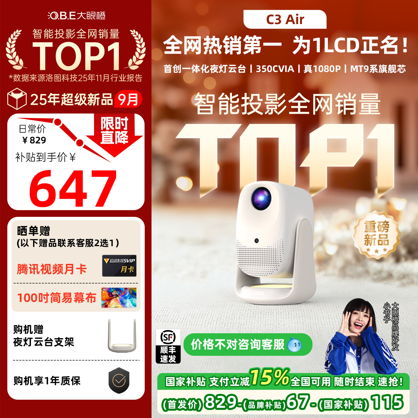 影音电器 【年度新品 政府补贴】大眼橙C3 Air投影仪高亮家用高清放映机1080P便携4K解码影院卧室宿舍无需幕布可连手机