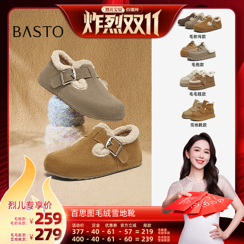 女鞋 【 先加购!7号炸烈0元付定】百思图冬加绒保暖勃肯毛毛鞋雪地靴