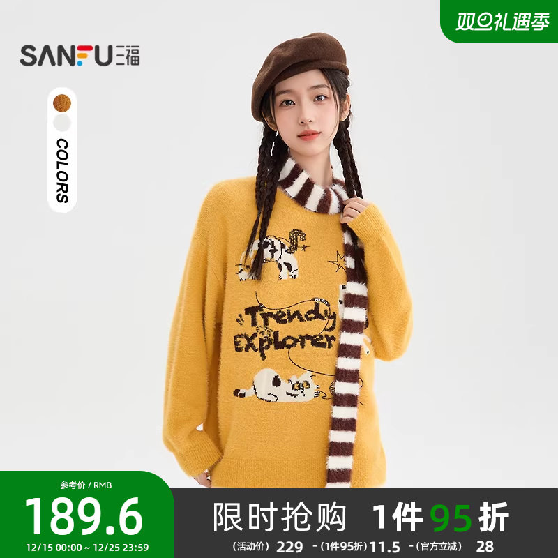 女装/女士精品 三福毛衣冬季女2025新款毛球围巾圆领宽松时尚休闲上衣女装513495