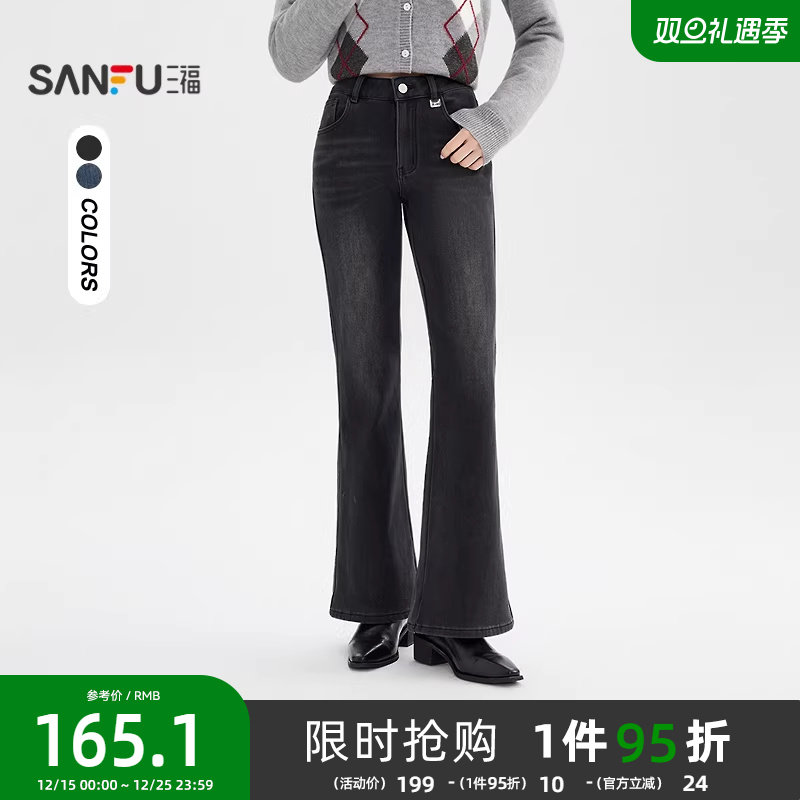 女装/女士精品 浅蓝加厚加绒微喇牛仔裤女秋冬季新款高腰紧身显瘦弹力百搭喇叭裤