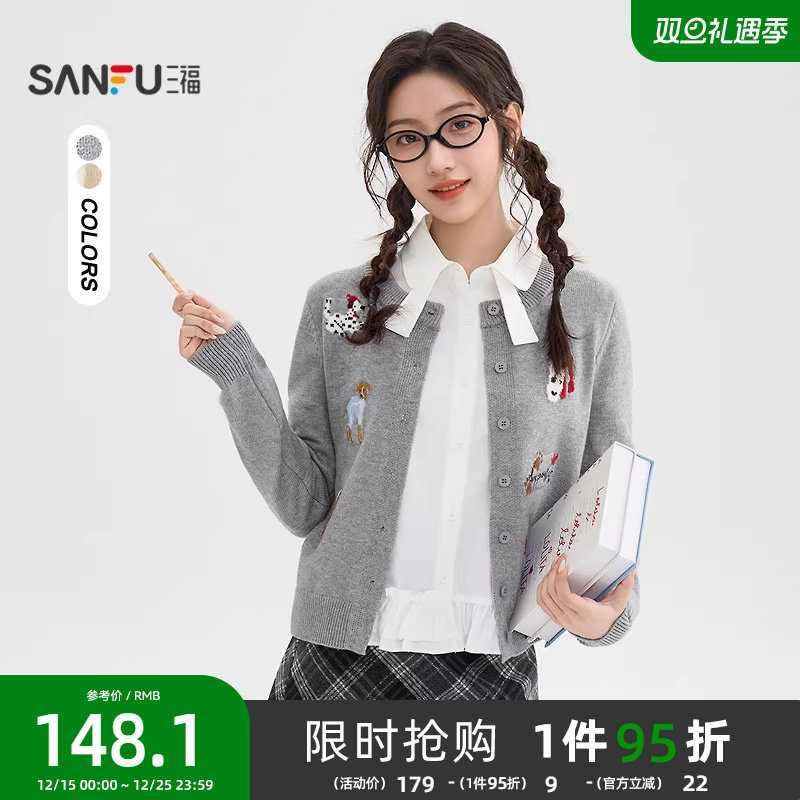 女装/女士精品 三福毛衣女2025新款冬季小狗图案纽扣开衫可爱保暖上衣女装513513