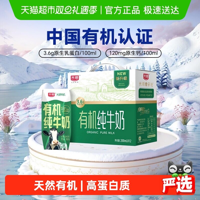 咖啡/麦片/冲饮 光明有机纯牛奶3.6g乳蛋白200mLX12礼盒装享受品质生活早餐奶