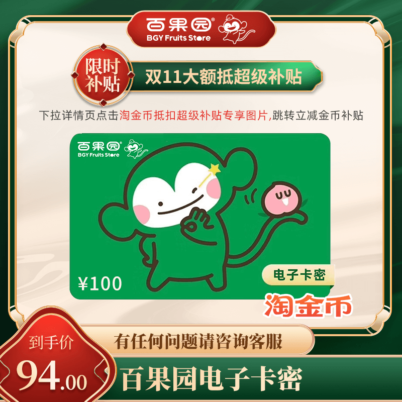购物提货券 直充【下拉详情页跳淘金币优惠】百果园100元代金券 可充值余额