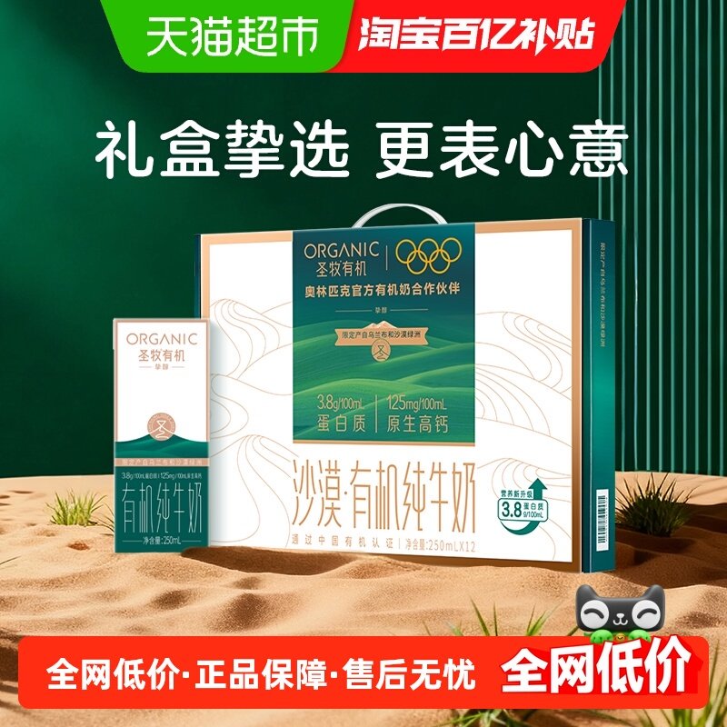 咖啡/麦片/冲饮 圣牧有机奶挚醇全脂纯牛奶250ml*12盒3.6g蛋白质早餐牛奶送礼盒装
