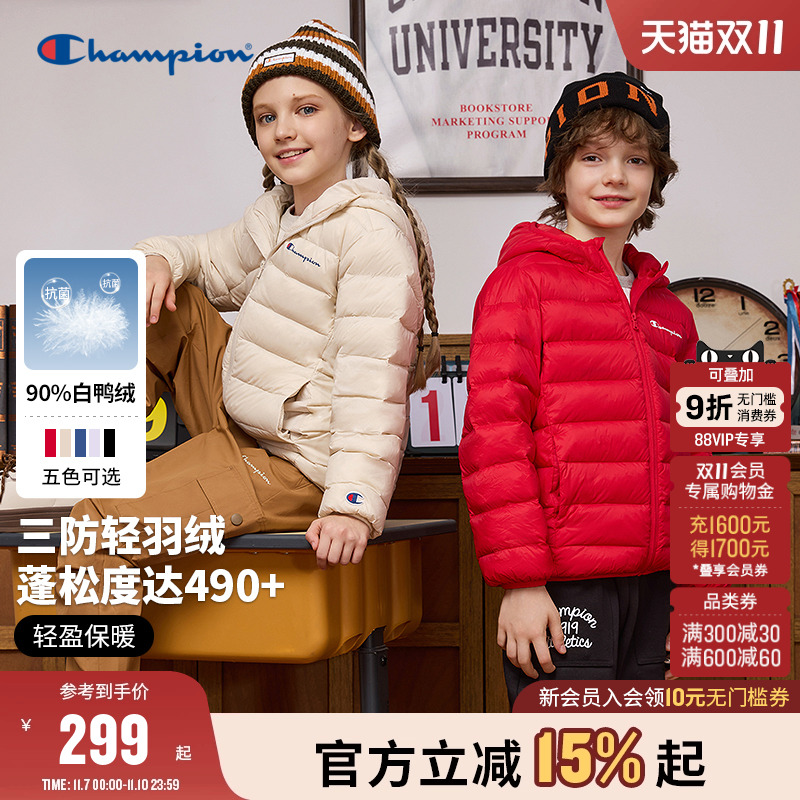 童装/婴儿装/亲子装 Champion冠军童红色羽绒服25冬季新款三防蓄热保暖轻薄抗菌羽绒服
