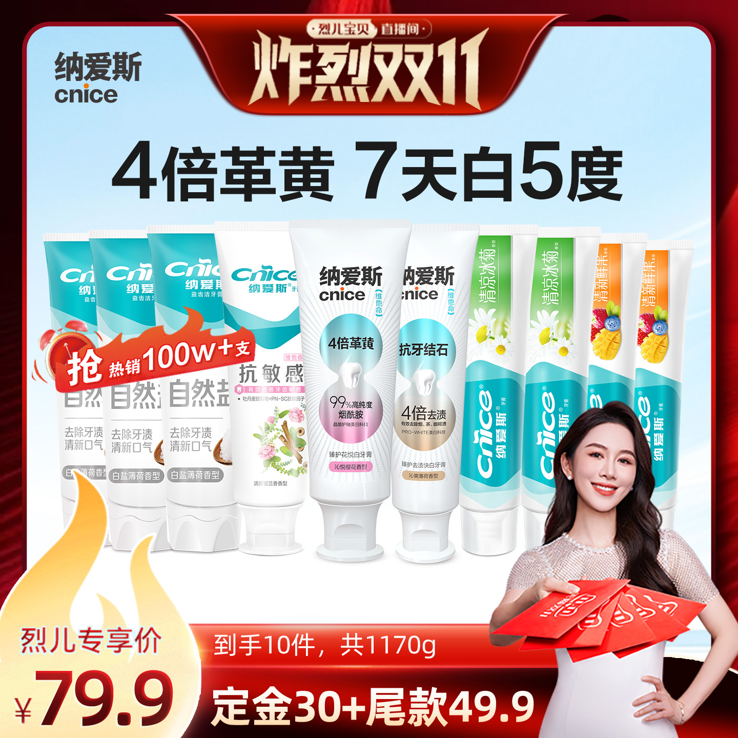洗护清洁剂/卫生巾/纸/香薰 【先加购!7号炸烈0元付定】纳爱斯美白抗牙结石去渍抗敏牙膏10件