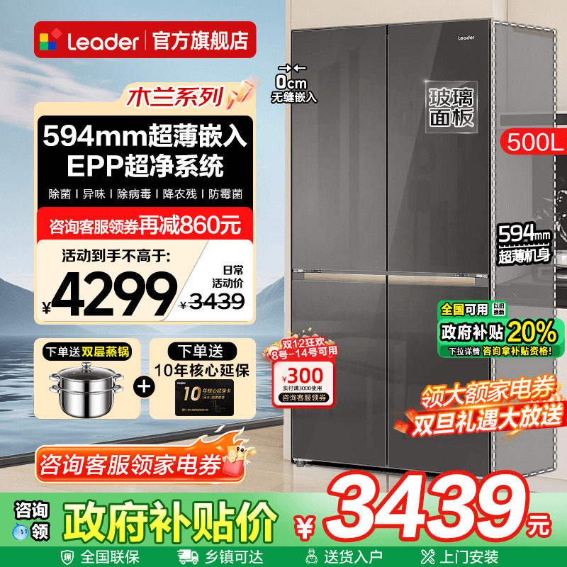 大家电 玻璃面板海尔电冰箱超薄500L零嵌入式Leader一级家用十字门旗舰店
