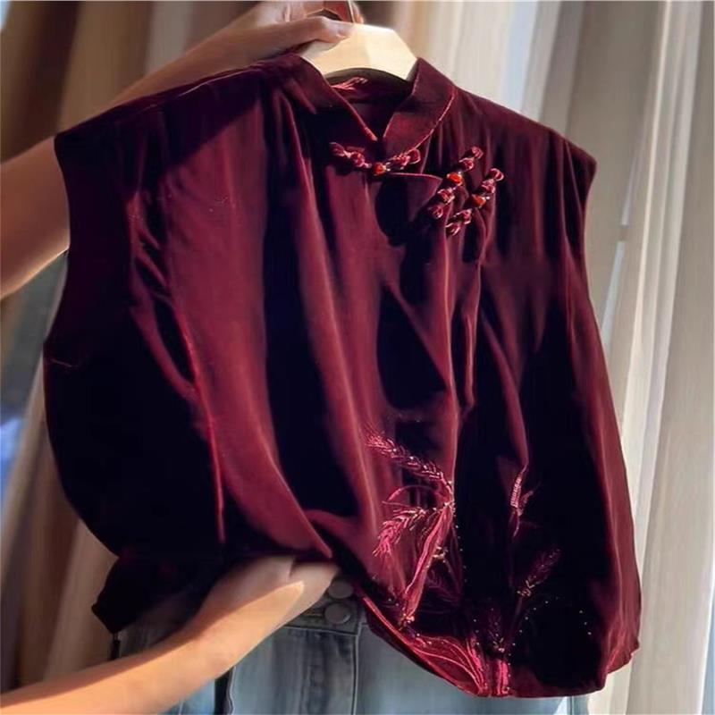 女装/女士精品 专柜撤回尾单巨好看的早秋上衣女装新中式国风气质酒红色丝绒马甲