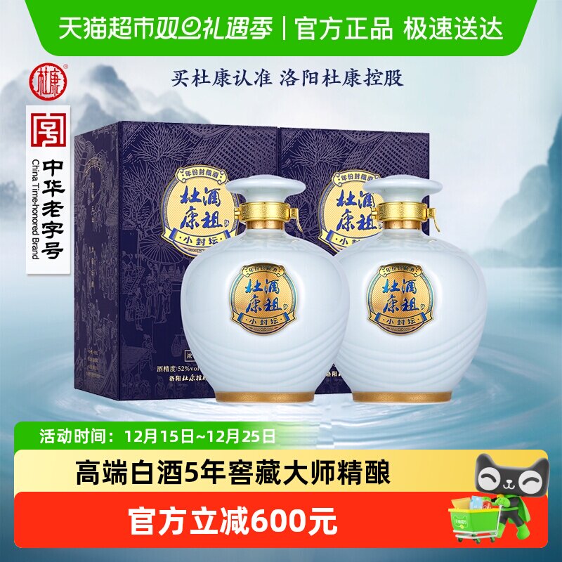 酒类 酒祖杜康小封坛玉坛5年坛藏浓香型白酒年份酒52度500mL*2整箱装