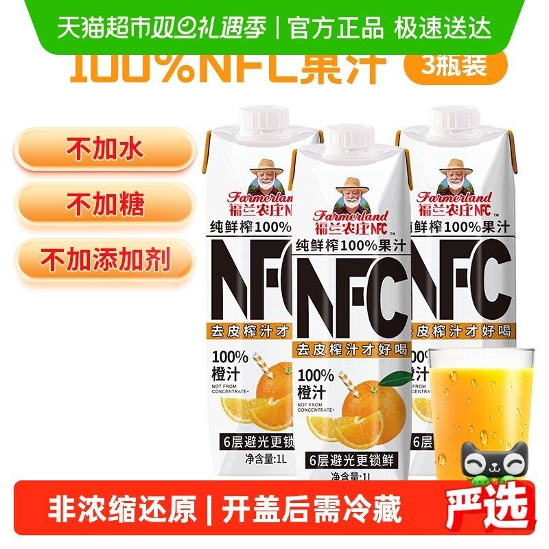 咖啡/麦片/冲饮 【NFC橙汁】福兰农庄100%纯鲜榨橙汁果汁饮料1L*3盒家庭聚会饮料