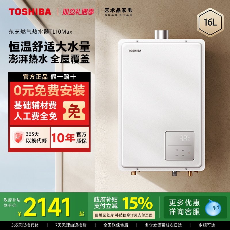 大家电 东芝大白梨强排式燃气热水器家用天然气增压水伺服恒温16LTL10MAX