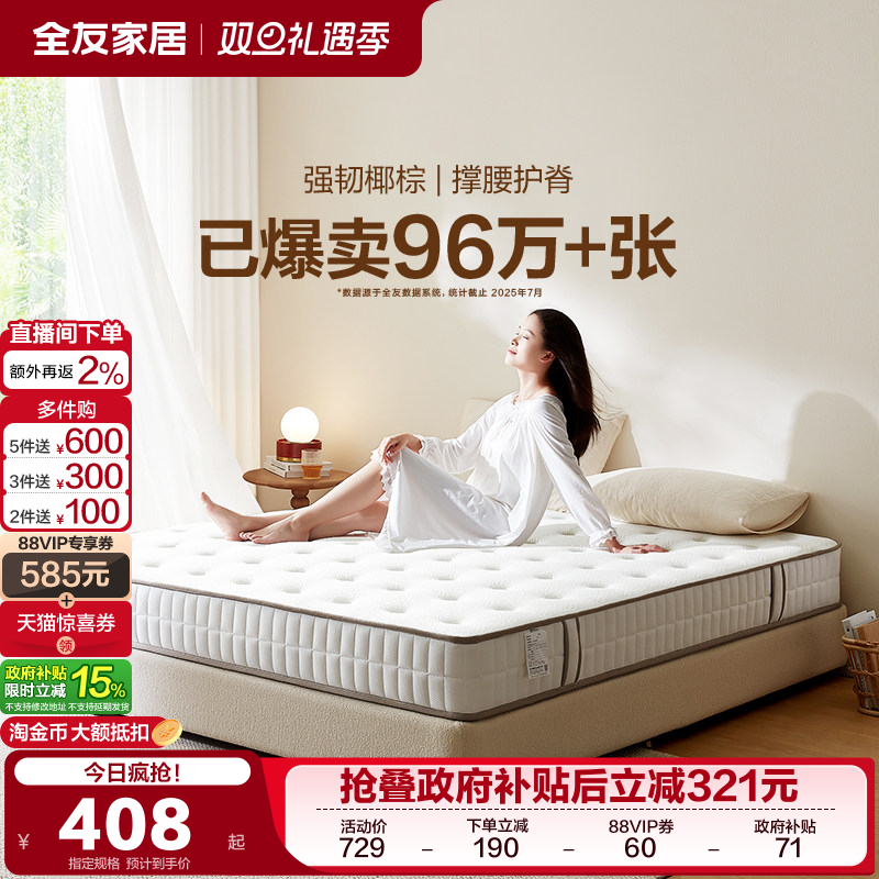 住宅家具 政府补贴全友家居席梦思弹簧床垫家用卧室椰棕硬垫床垫子180x200