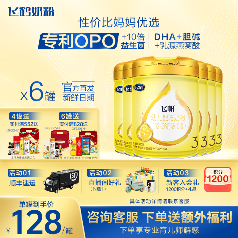婴童奶粉 【保价}飞鹤飞帆呵护三段婴幼儿奶粉900g*6罐官方旗舰店正品保价